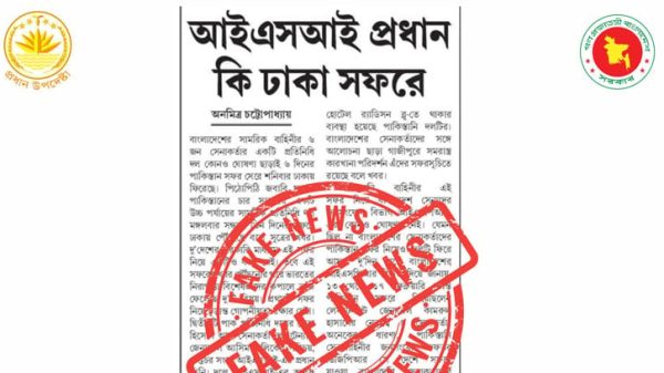 প্রধান উপদেষ্টার প্রেস উইং ফ্যাক্টস জানিয়েছে, পাকিস্তানি গোয়েন্দা সংস্থা আইএসআই-এর প্রধান বাংলাদেশ সফরে আসেননি। সংবাদপত্র এবং সোশ্যাল মিডিয়ায় প্রচারিত এ সংক্রান্ত খবর মিথ্যা। প্রধান উপদেষ্টার প্রেস উইং ফ্যাক্টস আজ তাদের