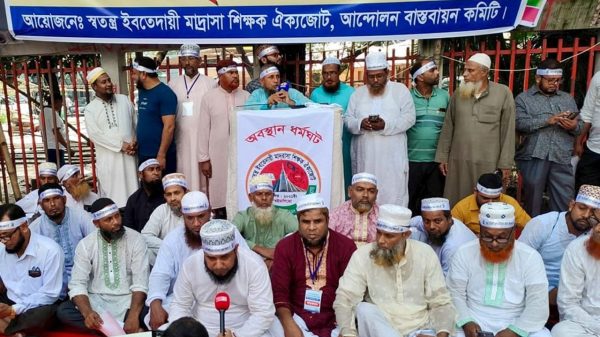 বাংলাদেশ মাদরাসা শিক্ষা বোর্ড কর্তৃক স্বীকৃতিপ্রাপ্ত অনুদানভুক্ত ও অনুদানবিহীন সকল স্বতন্ত্র ইবতেদায়ি মাদরাসা দ্রুত জাতীয়করণের দাবিতে লাগাতার অবস্থান ধর্মঘট পালন করছেন শিক্ষকরা। সোমবার জাতীয় প্রেসক্লাবের সামনে স্বতন্ত্র ইবতেদায়ি মাদরাসা শিক্ষক