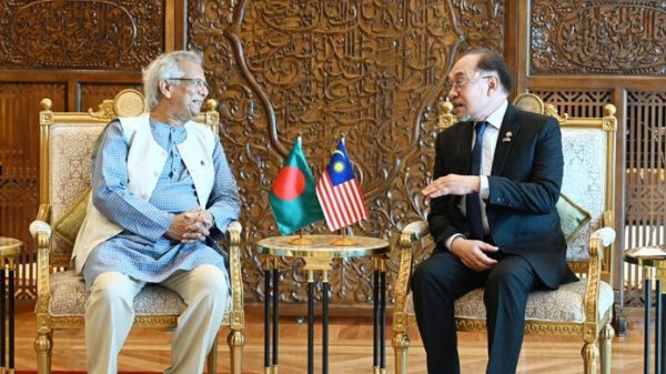 মালয়েশিয়ার প্রধানমন্ত্রী আনোয়ার ইব্রাহিমের সঙ্গে আনুষ্ঠানিক দ্বিপক্ষীয় বৈঠকে বসেছেন। মঙ্গলবার (১২ আগস্ট ২০২৫) সকালে মালয়েশিয়ার প্রশাসনিক রাজধানী পুত্রজায়ায় প্রধানমন্ত্রীর কার্যালয়ে এই বৈঠক শুরু হয়। প্রধান উপদেষ্টার ভেরিফায়েড ফেসবুক পেজে বাংলাদেশ