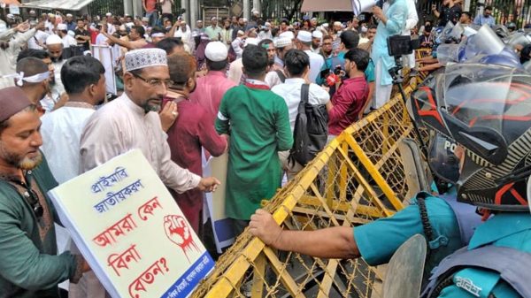 নতুন কর্মসূচি ঘোষণা দিয়েছে স্বতন্ত্র ইবতেদায়ি মাদরাসা শিক্ষক ঐক্যজোট। বুধবার (২২ অক্টোবর) সচিবালয়ে স্মারকলিপি দিতে গিয়ে শিক্ষা উপদেষ্টার সঙ্গে সাক্ষাৎ না হওয়ায় ক্ষোভ প্রকাশ করেন সংগঠনের নেতারা। এ ঘটনায় নতুন