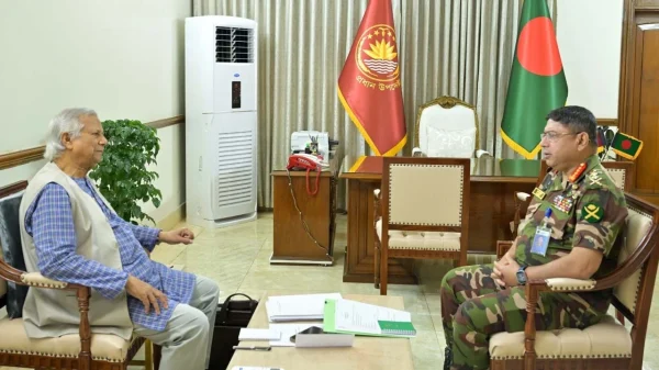প্রধান উপদেষ্টা ড. মুহাম্মদ ইউনূসের সঙ্গে সাক্ষাৎ করেছেন সেনাবাহিনী প্রধান জেনারেল ওয়াকার-উজ-জামান। বুধবার রাষ্ট্রীয় অতিথি ভবন যমুনায় তারা এ সৌজন্য সাক্ষাৎ করেছেন বলে জানিয়েছে আন্তঃবাহিনী জনসংযোগ পরিদপ্তর (আইএসপিআর)। সাক্ষাৎকালে সেনাপ্রধান