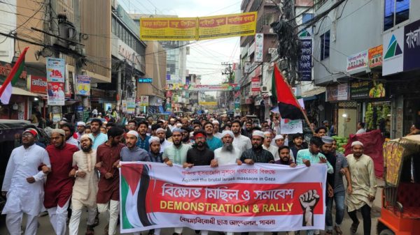 ফিলিস্তিনের গাজায় শিশু ও নারী গণহত্যাকারী বর্বর ইসরাইলি বাহিনী ও তাদের দোসরদের বিরুদ্ধে বিক্ষোভ মিছিল ও সমাবেশ করেছে পাবনার সর্বস্তরের তৌহিদী জনতা। বিক্ষোভ সমাবেশ থেকে প্রয়োজনে ফিলিস্তিনে যুদ্ধে যাওয়ার ঘোষণা