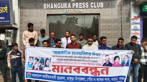 পাবনার ভাঙ্গুড়ায় আন্তর্জাতিক মানবাধিকার দিবস উপলক্ষে গুমের শিকার ছাত্রদলের সব নেতাকর্মী ও নাগরিকের মুক্তির দাবিতে মানববন্ধন করেছে জাতীয়তাবাদী ছাত্রদল। আজ মঙ্গলবার (১০ ডিসেম্বর) বেলা সাড়ে ১১ টার দিকে উপজেলা, পৌর