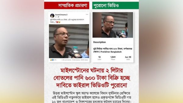 উত্তরার বিমান দুর্ঘটনার পর হতাহতের ঘটনার প্রেক্ষাপটে ‘২ লিটার পানির বোতল ৬০০ টাকায় বিক্রি’-এই ভুয়া ও বিভ্রান্তিকর তথ্য সামাজিক যোগাযোগ মাধ্যমে ছড়িয়ে পড়েছে। এ ধরনের অপপ্রচার ও অপতথ্য শনাক্ত করেছে