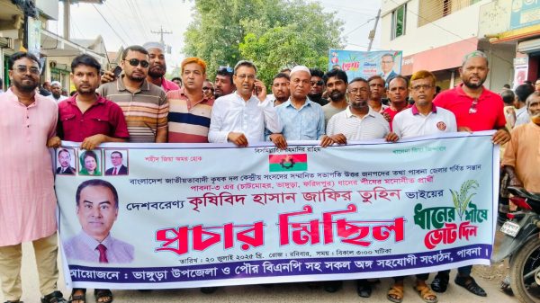 আসন্ন ত্রয়োদশ জাতীয় সংসদ নির্বাচনকে সামনে রেখে পাবনার ভাঙ্গুড়ায় পাবনা-৩ আসনের ( ভাঙ্গুড়া, ফরিদপুর ও চাটমোহর ) দলের প্রাথমিক মনোনীত প্রার্থী কৃষক দলের সভাপতি কৃষিবিদ হাসান জাফির তুহিনের প্রচার মিছিল