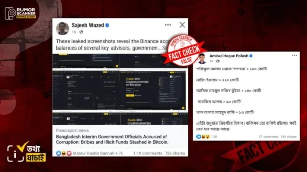 ফ্যাক্টচেকিং প্রতিষ্ঠান রিউমার স্ক্যানারের অনুসন্ধানে অন্তর্বর্তীকালীন সরকারের উপদেষ্টা, প্রেস সচিব ও জুলাই-আগস্ট আন্দোলনের নেতাদের নামে বাইনান্স অ্যাকাউন্টের স্ক্রিনশট সংক্রান্ত প্রচারিত দাবিটি সম্পূর্ণ ভুয়া ও ভিত্তিহীন বলে প্রমাণিত হয়েছে। রিউমার স্ক্যানার