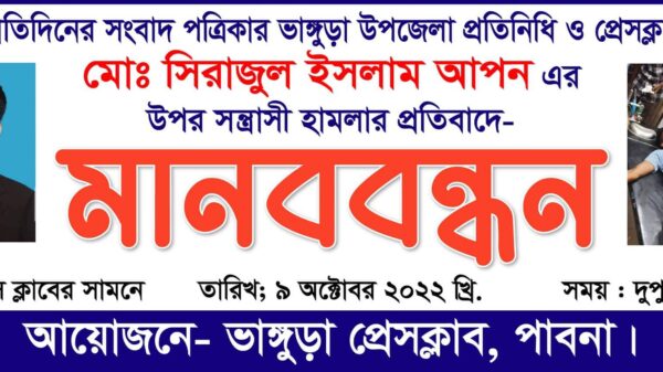 ভাঙ্গুড়া প্রতিনিধি: পাবনার ভাঙ্গুড়ায় দৈনিক প্রতিদিনের সংবাদ পত্রিকার উপজেলা প্রতিনিধি সাংবাদিক সিরাজুল ইসলাম আপন এর ওপর সন্ত্রাসী হামলার প্রতিবাদে রবিবার দুপুরে মানববন্ধন কর্মসূচি পালন করেছে স্থানীয় সাংবাদিকরা। মানববন্ধনে আগামী ৭২