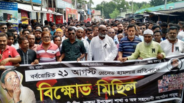২১ আগস্ট গ্রেনেড হামলার প্রতিবাদে পাবনার ভাঙ্গুড়ায় বিক্ষোভ মিছিল ও প্রতিবাদ সমাবেশ করেছে উপজেলা আওয়ামী লীগ ও সহযোগি সংগঠনের নেতাকর্মীরা। রোববার দুপুরে উপজেলা আওয়ামীলীগের দলীয় কার্যালয়ের সামনে থেকে বিশাল বিক্ষোভ