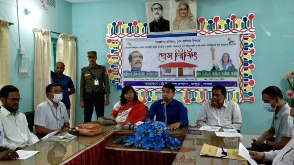 আশ্রয়নের অধিকার শেখ হাসিনার উপহার – প্রধানমন্ত্রী শেখ হাসিনা কর্তৃক মুজিববর্ষ উপলক্ষে ভূমিহীন ও গৃহহীন পরিবারকে জমি ও গৃহ প্রদান কার্যক্রমের শুভ উদ্বোধন উপলক্ষে প্রেস ব্রিফিং অনুষ্ঠিত হয়। শনিবার পাবনার