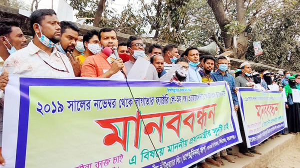 সুপ্রিম নীটওয়্যার লিমিটেডের লে-অফ প্রত্যাহার করে বন্ধ কারখানা চালু করার দাবিতে দাবিতে রাজধানীতে মানববন্ধন ও সমাবেশ হয়েছে। শনিবার (২০ ফেব্রুয়ারি) জাতীয় প্রেসক্লাবের সামনে সকল শ্রমিক ও কর্মচারীদের ব্যানারে কর্মসূচি পালন