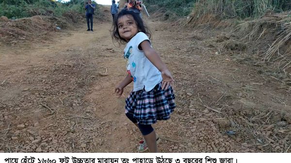 এস এম মাসুদ রানা, চাটমোহর ( পাবনা) পাবনা পায়ে হেঁটে বান্দরবনের ১৬৬০ ফুট উচ্চতার মারায়ন তং পাহাড়ে উঠে সবাইকে হতবাক করে দিয়েছেন পাবনার চাটমোহরের তিন বছরের শিশু সাবিলা মোস্তাফিজ জারা।