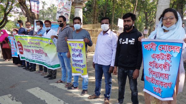 পাবনার আটঘরিয়ায় বাংলাদেশ প্রতিবন্ধী বিদ্যালয় শিক্ষক সমিতির আহবানে গতকাল রোববার সকাল এগারোটার সময় উপজেলা প্রধান ফটকের সামনে এক “মানববন্ধন ও স্মারকলিপি প্রদান” অনুষ্ঠিত হয়েছে। পিএসএস অপিজম ও প্রতিবন্ধী বিদ্যালয় এর