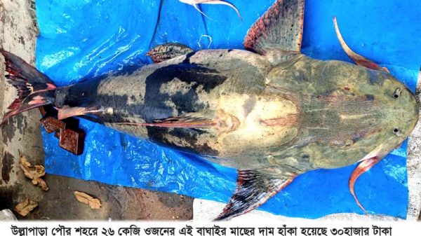 উল্লাপাড়া (সিরাজগঞ্জ) প্রতিনিধিঃ উল্লাপাড়া পৌরশহরের উপজেলা গেটে ২৬ কেজি ওজনের একটি বাঘাইর মাছ বিক্রির জন্য নিয়ে আসেন ইসমাইল হোসেন নামের এক ব্যক্তি। বগুড়ার শেরপুরের বাসিন্দা ইসমাইল মাছটির দাম হাঁকে ৩০