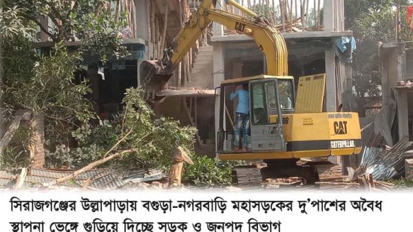 উল্লাপাড়া (সিরাজগঞ্জ) প্রতিনিধি ঃ বগুড়া-নগরবাড়ী মহাসড়ক চার লেনে উন্নীত করার লক্ষ্যে সড়ক ও জনপথ বিভাগ (সওজ) উলাপাড়া পৌরসভার পুরান বাসস্ট্যান্ড এলাকায় সড়কের দুপাশের অবৈধ স্থাপনা উচ্ছেদ অভিযান শুরু করেছে। মঙ্গলবার