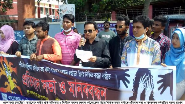 সারাদেশে নারীর প্রতি সহিংসতা ও নিপীড়ন বন্ধসহ চলমান ধর্ষণের দ্রুত বিচার নিশ্চিত করার দাবীতে প্রতিবাদ সভা ও মানববন্ধন কর্মসূচী পালন করেছেন বাংলাদেশ পাবলিক ইউনিভার্সিটি স্টুডেন্টস্ এ্যাসোসিয়েশন অব নাটোর (পুসান)। শনিবার
