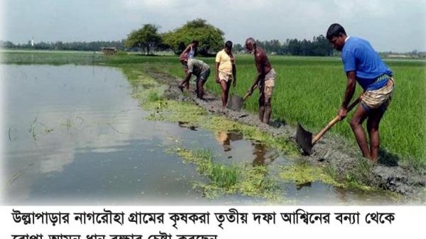 উল্লাপাড়া(সিরাজগঞ্জ) প্রতিনিধিঃ করতোয়া ও বিলসূর্য নদীর পানি বৃদ্ধির ফলে উলাপাড়া উপজেলার ১৪ ইউনিয়নের প্রায় আড়াই হাজার বিঘা জমির ফসল ডুবে নষ্ট হয়ে গেছে। আশ্বিনের এই বন্যায় মারাত্বক ক্ষতির সম্মূখীন হয়েছেন