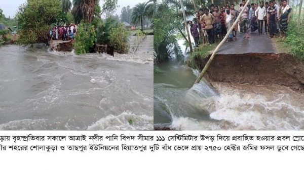 নাটোরের সিংড়ায় আত্রাই নদীর পানি অব্যাহত বৃদ্ধিতে সিংড়া পৌর এলাকার ১২টি ওয়ার্ড প্লাবিত হয়েছে। বৃহস্পতিবার আত্রাই নদীর পানি সিংড়া পয়েন্টে বিপদসীমার ১১১ সে:মি: উপর দিয়ে প্রবাহিত হচ্ছে। বুধবার রাত ২