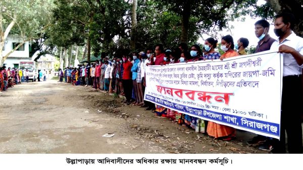 উল্লাপাড়া (সিরাজগঞ্জ) প্রতিনিধিঃ উল্লাপাড়ার প্রাচীন চৈত্রহাটি শ্রী শ্রী জগদ্বিশ্বরী মাতা মন্দিরে তালা ভাঙ্গা, মূর্তি ভাংচুর, স্বর্ণালাঙ্কার ও বাসনকোসন চুরি, মন্দিরের জমি দখল, আদিবাসীদের বিরুদ্ধে মিথ্যা মামলা ও নির্যাতনের প্রতিবাদে এক