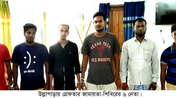 উল্লাপাড়া(সিরাজগঞ্জ) প্রতিনিধিঃ উলাপাড়া মডেল থানা পুলিশ বৃহস্পতিবার গভীর রাতে ককটেল, জিহাদী বই, ইসলামী ছাত্র শিবিরের সংবিধান ও ব্যক্তিগত প্রতিবেদন বই সহ জামায়াত ও ইসলামী ছাত্র শিবিরের ৬ নেতাকে গ্রেফতার করেছে।