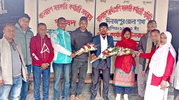 দিনাজপুর জেলা প্রতিনিধি: দিনাজপুরে ২১ জানুয়ারী (বুধবার) বাংলাদেশ চতুর্থ শ্রেণি সরকারি কর্মচারী সমিতির আয়োজনে ৩ জন কার্যনির্বাহী কমিটির সদস্য পদে পদোন্নতি পাওয়ায় তাদের ফুল দিয়ে সংবর্ধনা প্রদান করা হয়েছে। অনুষ্ঠানে
