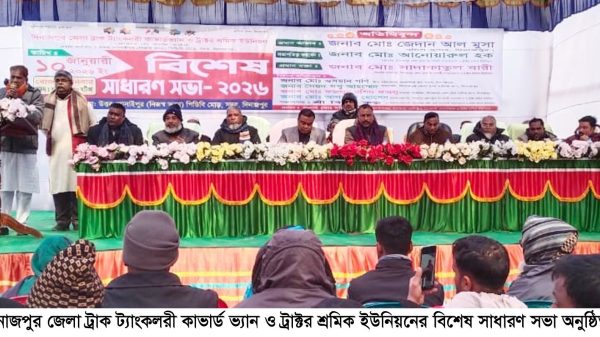কোয়াসিম সিদ্দিকী জনী, ভ্রাম্যমান বিশেষ প্রতিনিধি প্রতিনিধিঃ দিনাজপুর জেলা ট্রাক ট্যাংকলরী কাভার্ড ভ্যান ও ট্রাক্টর শ্রমিক ইউনিয়ন (রেজিঃ নং-রাজ-২৪৫) এর বিশেষ সাধারণ সভা-২০২৬ অনুষ্ঠিত হয়েছে। বিশেষ সাধারণ সভায় সংগঠনের