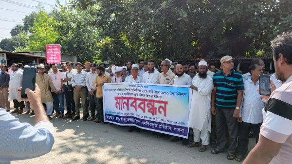 পাবনার ভাঙ্গুড়ায় বাড়িভাড়া ও চিকিৎসা ভাতা বৃদ্ধিসহ বিভিন্ন দাবিতে এমপিওভুক্ত শিক্ষাপ্রতিষ্ঠানের শিক্ষক, কর্মকর্তা ও কর্মচারীদের উদ্যোগে মানববন্ধন কর্মসূচি অনুষ্ঠিত হয়েছে। আজ মঙ্গলবার (১৪ অক্টোবর) সকালে উপজেলার বাসস্ট্যান্ড চত্বরে মানববন্ধন অনুষ্ঠিত