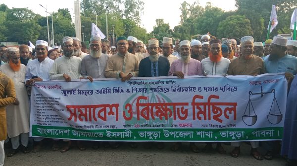 পাবনার ভাঙ্গুড়ায় সংসদের উভয় কক্ষে পিআর পদ্ধতিতে জাতীয় সংসদ নির্বাচনসহ ৫ দফা দাবিতে বিক্ষোভ মিছিল ও সমাবেশ অনুষ্ঠিত হয়েছে। আজ শুক্রবার (২৬ সেপ্টেম্বর) বিকেলে কেন্দ্রীয় কর্মসূচির অংশ হিসেবে উপজেলা জামায়াতে ইসলামীর উদ্যোগে