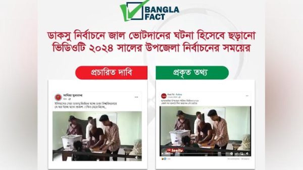 ঢাকা বিশ্ববিদ্যালয় কেন্দ্রীয় ছাত্র সংসদ (ডাকসু) নির্বাচনে জাল ভোট হয়েছে বলে সামাজিক যোগাযোগমাধ্যমে ছড়ানো একটি ভুয়া ভিডিও শনাক্ত করেছে প্রেস ইনস্টিটিউট বাংলাদেশ (পিআইবি)’র ফ্যাক্ট চেক ও মিডিয়া রিসার্চ টিম বাংলাফ্যাক্ট।