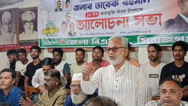 বিএনপির ভারপ্রাপ্ত চেয়ারম্যান তারেক রহমানের ১৮তম কারামুক্তি দিবস উপলক্ষে সিরাজগঞ্জ জেলা বিএনপির আয়োজনে এক আলোচনা সভা অনুষ্ঠিত হয়েছে। বুধবার (৩ সেপ্টেম্বর) সন্ধ্যায় জেলা বিএনপির সহ-সভাপতি মকবুল হোসেন চৌধুরীর সভাপতিত্বে এ