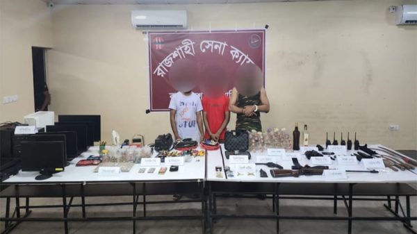 রাজশাহী মহানগরীতে যৌথ বাহিনীর অভিযানে অস্ত্র ও বিস্ফোরকসহ আটক তিনজনকে আদালতে নেওয়া হয়েছে। আজ রোববার দুপুরে তাদের বোয়ালিয়া মডেল থানা থেকে আদালতে নেওয়া হয়। এদিকে আটক মোস্তাসেরুল আলম অনিন্দ্য (৩৩)