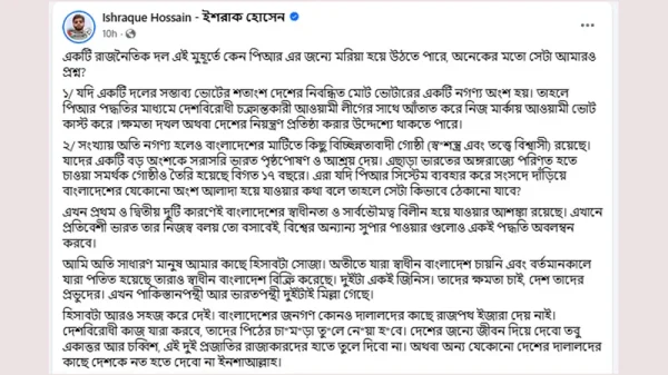 পিআর (আনুপাতিক প্রতিনিধিত্ব) পদ্ধতিসহ ৫ দফা দাবিতে ৩ দিনের নতুন কর্মসূচি ঘোষণা করেছে বাংলাদেশ জামায়াতে ইসলামী। মগবাজার আল-ফালাহ মিলনায়তনে সোমবার দুপুরে এক সংবাদ সম্মেলনের এসব দাবি ঘোষণা করা হয়। দলটির
