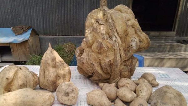 ঢাকার নবাবগঞ্জ উপজেলার গালিমপুর ইউনিয়নের সূর্যখালী ঈদগাহ মাঠ থেকে মিললো ২০ কেজি ওজনের মিষ্টি আলু। দানব আকৃতির আলুটি এক নজর দেখতে এলাকাবাসীসহ আশপাশের অনেক লোকজন ভিড় জমিয়েছে। স্থানীয় সৌখিন কৃষক