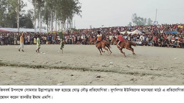 উল্লাপাড়া (সিরাজগঞ্জ) প্রতিনিধিঃ মুজিববর্ষ উপল¶ে সোমবার উল্লাপাড়ার মনোহরা গ্রামের মাঠে ঘোড় দৌড় প্রতিযোগিতার আয়োজন করা হয়। উলাপাড়ার সংসদ সদস্য তানভীর ইমাম দু’দিন ব্যাপী এ প্রতিযোগিতার উদ্বোধন করেন। দুর্গানগর ইউনিয়ন পরিষদ