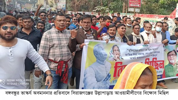 উল্লাপাড়া (সিরাজগঞ্জ) প্রতিনিধিঃ জাতীর পিতা বঙ্গবন্ধু শেখ মুজিবুর রহমানের ভাস্কর্যের অবমাননার প্রতিবাদে রোববার উল্লাপাড়া পৌরশহরে এক বিক্ষোভ মিছিলের আয়োজন করা হয়। উপজেলা আওয়ামী লীগ ও এর অঙ্গ সংগঠনসমূহ এই মিছিলের