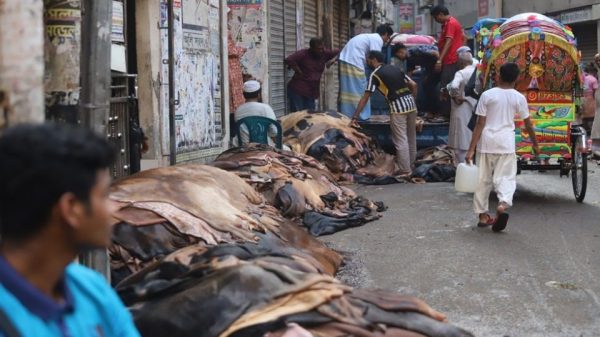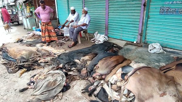 ঢাকার সায়েন্স ল্যাবরেটরি এলাকায় ২৫টি গরুর কাঁচা চামড়া বিক্রির জন্য নিয়ে এসেছেন মৌসুমি ব্যবসায়ী তালুকদার খালেক। মোহাম্মদপুর এলাকা ঘুরে কোরবানিদাতাদের কাছ থেকে চামড়া কিনেছেন তিনি। সরকার নির্ধারিত দাম হিসাব করে
