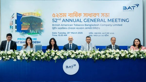 ব্রিটিশ আমেরিকান টোব্যাকো বাংলাদেশ কোম্পানি লিমিটেড (বিএটি বাংলাদেশ) ২০২৪ সালের জন্য ৩০০ শতাংশ নগদ লভ্যাংশের অনুমোদন দিয়েছে। বৃহস্পতিবার, ২৫শে মার্চ ২০২৫ তারিখে ভার্চুয়াল মাধ্যমে প্রতিষ্ঠানটির ৫২তম বার্ষিক সাধারণ সভা
