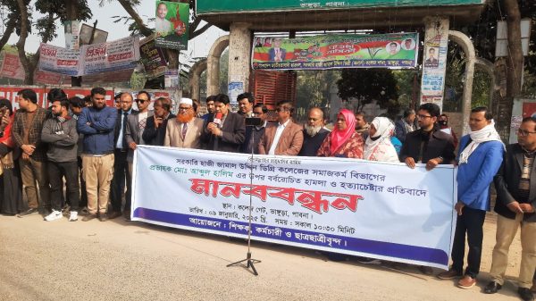 ভাঙ্গুড়া প্রতিনিধি : পাবনার ভাঙ্গুড়া উপজেলার সরকারি হাজী জামাল উদ্দিন ডিগ্রি কলেজের সমাজকর্ম বিভাগের প্রভাষক আব্দুল হালিমের উপর সন্ত্রাসী হামলা ও তাকে হত্যা চেষ্টার প্রতিবাদে বৃহস্পতিবার(৯ জানুয়ারি) শিক্ষকরা মানববন্ধন কর্মসূচী