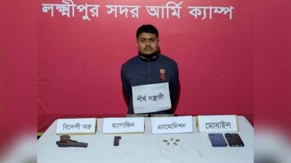জেলা প্রতিনিধি লক্ষ্মীপুরের চন্দ্রগঞ্জে সেনাবাহিনী ও পুলিশের এক যৌথ অভিযানে হাসান তারেক ওরফে ‘চিতা তারেক’ (৩০) নামে এক যুবদল ক্যাডার ও শীর্ষ সন্ত্রাসীকে অস্ত্রসহ গ্রেপ্তার করা হয়েছে। ২২শে জানুয়ারি, বৃহস্পতিবার