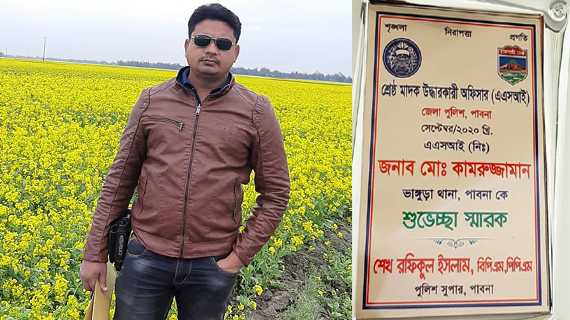 পাবনার ভাঙ্গুড়া থানায় সেপ্টেম্বর (২০২০) মাসের শ্রেষ্ঠ মাদক উদ্ধারকারী অফিসারের শুভেচ্ছা স্মারক পেলেন ভাঙ্গুড়া থানার এ এসআই জনাব মোঃ কামরুজ্জামান।বুধবার (২৮ অক্টোবর) দুপুর দুইটার দিকে এ শুভেচ্ছা স্মারক তার হাতে