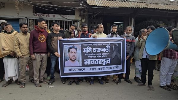 সফিকুল ইসলাম পলাশ (নরসিংদী) প্রতিনিধি: নরসিংদীর পলাশে মুদি ব্যবসায়ী মনি চক্রবর্তী হত্যার প্রতিবাদ ও হত্যাকারীদের বিচারের দাবিতে মানববন্ধন করেছে ব্যবসায়ীরা। আজ মঙ্গলবার (৬ জানুয়ারি) দুপুরে চরসিন্দুর বাজারে বাজার সমিতির
