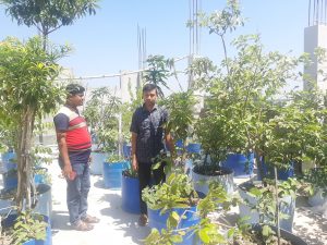 সরেজমিন কৃষিবিদ পার্থ প্রতিম সাহার ফ্যাক্টরির গোডাউনের ছাদে গিয়ে দেখা যায়, ১০০টির মতো অর্ধেক করে কাটা তেলের ড্রাম।তার মধ্যে মাটির সাথে মেশানো হয়েছে জৈবিক সার। ছোট বড় বেশ কিছু মাটির টব। সবগুলিতে লেবু ,ফলের গাছ, ও ওষুধি গাছ শোভা পাচ্ছে। গাছে ধরেছে অসংখ্য লেবু। বিশেষ করে চায়না স্কটলেবু একটি গাছে শতধিক লেবু ধরেছে যা বাগানের সৌন্দর্য্য আরও বাড়িয়ে তুলেছে। আর গাছের পোকামাকড় থেকে রক্ষা পেতে ন্যাপথন বেধে দেওয়া হয়েছে। অবসর সময়ে সুজন কুমার ও এই বাগানের পরিচর্যা করেন।