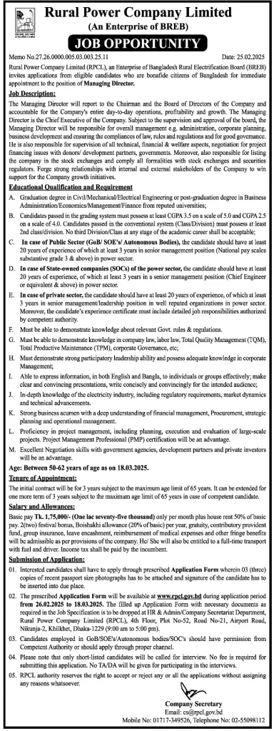 আবেদনপত্র সংগ্রহ: আগ্রহীরা রুরাল পাওয়ার কোম্পানি লিমিটেড এর মাধ্যমে আবেদনপত্র সংগ্রহ করতে পারবেন।