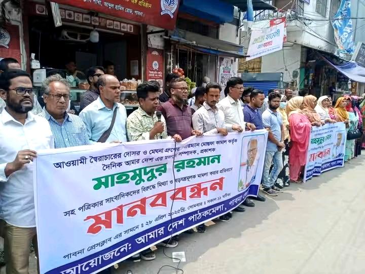 আওয়ামী স্বৈরাচারের দোসর মেঘনা গ্রুপের চেয়ারম্যান মোস্তফা কামালের দায়ের করা দৈনিক আমার দেশ-এর সম্পাদক মাহমুদুর রহমানসহ চার সাংবাদিকদের বিরুদ্ধে মিথ্যা ও ষড়যন্ত্রমূলক মামলা প্রত্যাহারের দাবিতে পাবনায় মানববন্ধন ও প্রতিবাদ সমাবেশ করা হয়েছে ।