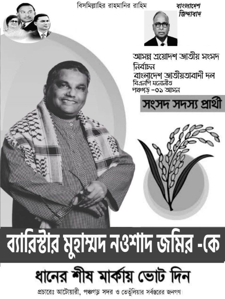 পঞ্চগড়ে আসন্ন জাতীয় সংসদ নির্বাচনে নতুন দিগন্ত নিয়ে এবার ভোটারদের কাছে পঞ্চগড়ের গৌরব সাবেক স্পিকার ব্যারিস্টার জমির উদ্দিন সরকার এর পুত্র নওশাদ জমির পঞ্চগড়ে সকল ভোটারদের বাড়ি বাড়ি গিয়ে কড়া নাড়ছেন। এবং বিভিন্ন প্রতিশ্রুতি দিয়ে মা বোন মুরুব্বিদের কাছে একটি করে ভোট ও দোয়া চাইছেন।