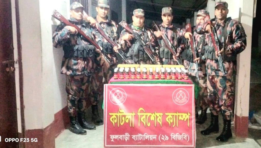 দিনাজপুরের ফুলবাড়িতে ২৫ জানুয়ারি (রবিবার) রাতে ২৯ বিজিবি’এর অধীনস্থ কাটলা বিশেষ ক্যাম্প ও রানীনগর বিওপি কর্তৃক ০২টি পৃথক চোরাচালান প্রতিরোধ অভিযান পরিচালনা করে ৩১২ বোতল বাংলাদেশী যৌন উত্তেজক সিরাপ এবং ১৫০ পিস ভারতীয় নেশাজাতীয় ইনজেকশন আটক করে। আটককৃত মাদকদ্রব্য ও চোরাচালানী মালামালের সিজার মূল্য ৬৯,৩০০/- (ঊনসত্তর হাজার তিনশত) টাকা।