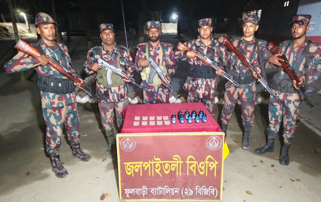 বর্ডার গার্ড বাংলাদেশ (বিজিবি) বাংলাদেশের সীমান্ত সুরক্ষার পাশাপাশি সীমান্তবর্তী এলাকার মানুষের জানমাল ও নিরাপত্তা নিশ্চিত করতে সর্বদা সচেষ্ট। চোরাচালান, মাদক, মানব ও অস্ত্র পাচারসহ বিভিন্ন আন্তঃসীমান্ত অপরাধ দমনে বাহিনীটি বরাবরই প্রশংসনীয় সাফল্য প্রদর্শন করে আসছে। এরই ধারাবাহিক অভিযানের অংশ হিসেবে সুনির্দিষ্ট গোয়েন্দা তথ্যের ভিত্তিতে ১৯ ফেব্রুয়ারি (বৃহস্পতিবার) রাত ১০ ঘটিকায় ফুলবাড়ী ব্যাটালিয়ন (২৯ বিজিবি)-এর অধীনস্থ খানপুর, জলপাইতলী এবং রুদ্রানী বিওপি কর্তৃক পৃথক পৃথক ৩টি চোরাচালান প্রতিরোধ অভিযান পরিচালনা করে ৯ বোতল ভারতীয় ফেন্সিডিল, ৪০০ পিস ভারতীয় নেশাজাতীয় ট্যাবলেট, ২০ বোতল বিদেশী মদ এবং ৫৩ বোতল ইস্কফ সিরাপ আটক করতে সক্ষম হয়। আটককৃত মাদকদ্রব্যের সিজার মূল্য সর্বমোট ৮৬,৮০০ (ছিয়াশি হাজার আটশত) টাকা।