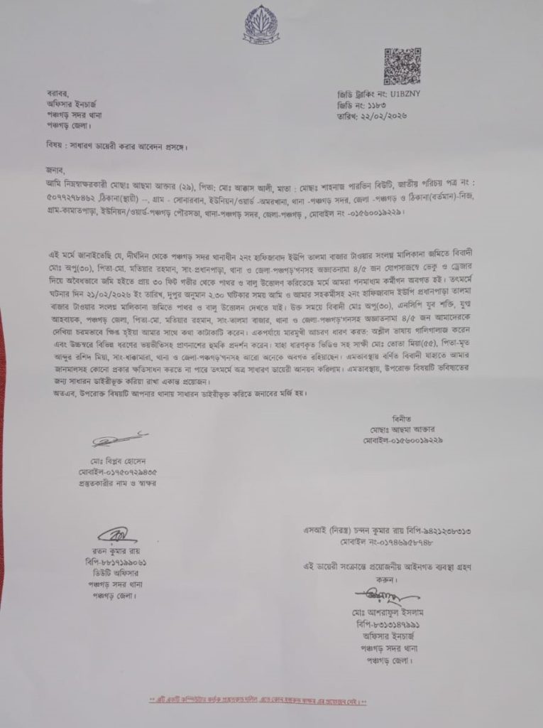 জান মালের নিরাপত্তা চেয়ে আইনের প্রতি শ্রদ্ধাশীল হয়ে পঞ্চগড় সদর থানায় জিডি করেন যার
