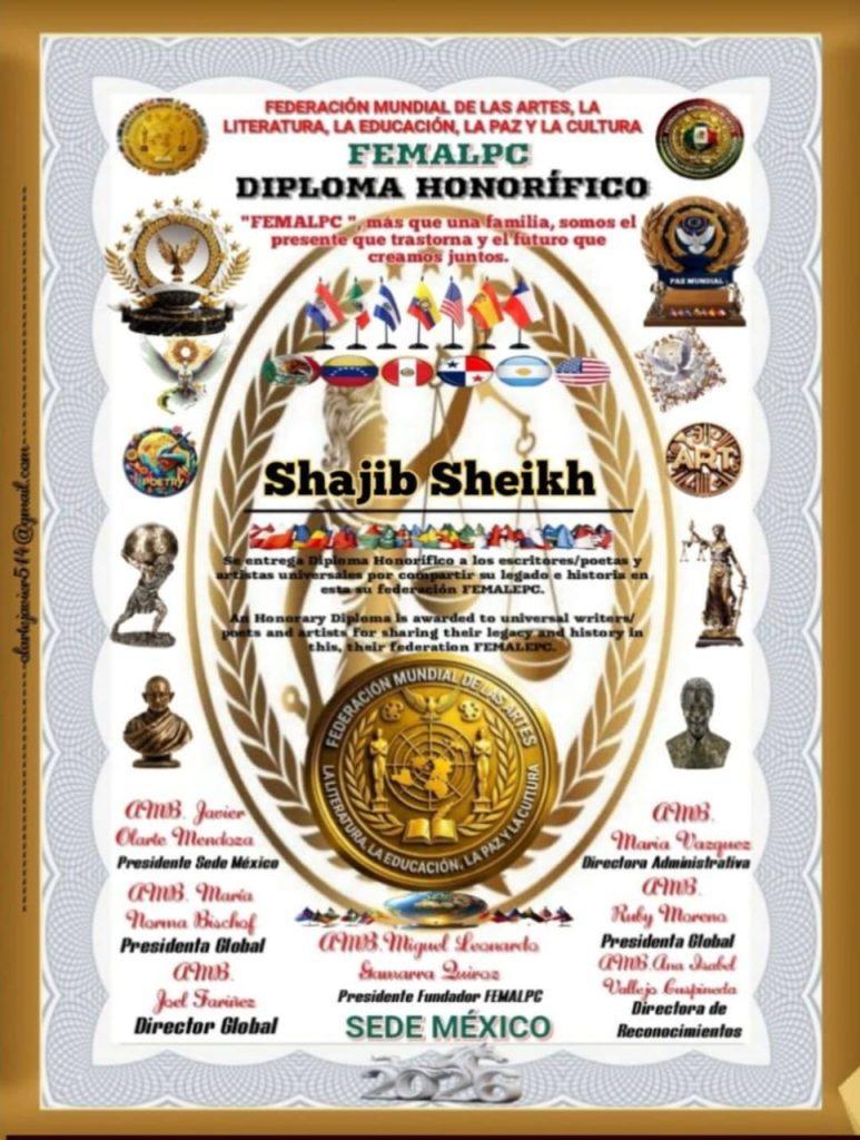 জামালপুরের তরুণ কবি ও লেখক সজিব শেখ আন্তর্জাতিক সাহিত্য সংগঠন Federación Mundial de las Artes, la Literatura, la Educación, la Paz y la Cultura (FEMALPC) থেকে সম্মানসূচক ডিপ্লোমা অর্জন করেছেন। শিল্প, সাহিত্য, শিক্ষা, শান্তি ও সংস্কৃতিতে অবদানের স্বীকৃতিস্বরূপ তাকে এই “Diploma Honorífico” প্রদান করা হয়।