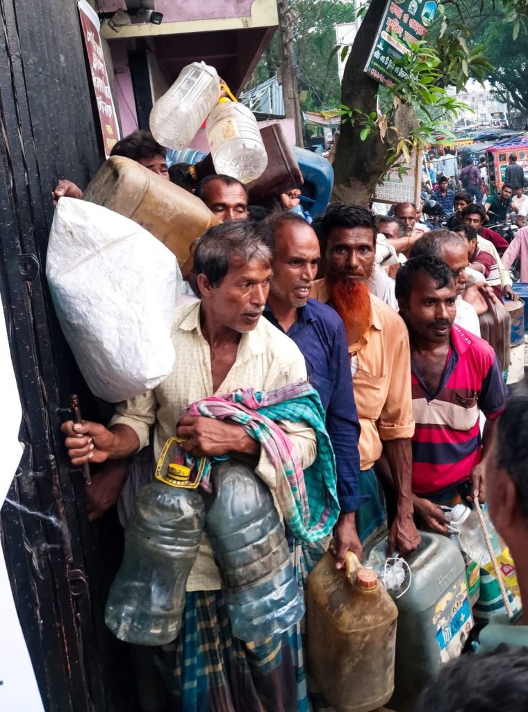 ডিজেলের দাম বেড়েছে। সেটা তারা জেনে গেছেন। কিন্তু তাতেও সমস্যা নেই। প্রয়োজনীয় টাকাও তাদের হাতে আছে। হাতে গ্যালন, বড় বোতলও আছে। সন্ধ্যা ছয়টায় জ্বালানি তেল ডিলার পয়েন্টে তেল বিক্রি বন্ধ হয়ে গেছে। ছবিটি ১৯ এপ্রিল সন্ধ্যা ছয়টা দশ মিনিটে তোলা। এর আগে সেখানে সারাদিন কিছু কৃষক তেল কিনতে পারেন। একই সাথে লাইনে থাকা সাধারণ বাইক চালকদের কাছে পেট্রল বিক্রি করার কারণে এবং ভিআইপি, তদবির ও জরুরি সরকারি বেসরকারি সেবা দানকারী বাইক চালকদের কাছে লাইনের বাইরে বিশেষ ব্যবস্থায় পেট্রল বিক্রি করার কারণে লাইনে থাকা কৃষক ও সাধারণ বাইক চালকেরা জ্বালানি তেল পেতে ধীর গতির শিকার হন। ফলে সন্ধ্যায় তখনও লাইনে আছেন শতাধিক কৃষক। যারা তাদের সেচ পাম্পের জন্য ডিজেল কিনতে এসে সারাদিন লাইনে দাঁড়িয়ে ছিলেন। কিন্তু দিন শেষে ডিজেল কিনতে না পেরে বাড়ি ফিরে গেছেন তারা। এমন পরিস্থিতি চলমান থাকা মোটেই উচিৎ নয়। বোরো ধানসহ অন্যান্য ফসল আবাদের এই শুকনো মওসুমে ক্ষেতে পানিসেচের পিকসিজন চলছে। একদিকে জ্বালানি তেলের দাম বাড়ানো হয়েছে। অন্যদিকে প্রতিদিন শহরে আসতেও যাতায়াত খরচ বাবদ অনেক টাকাও খরচ হয়ে যাচ্ছে কৃষকদের। কৃষকদের জন্য জামালপুর জেলা প্রশাসন ও জেলা কৃষি সম্প্রসারণ অধিদপ্তরের বিশেষ ব্যবস্থা বা কার্যকর পদক্ষেপ গ্রহণ জরুরি হয়েছে পড়েছে। ছবিটি জ্বালানি তেল ডিলার পয়েন্ট জুঁই এন্টারপ্রাইজের সামনের চিত্র। অন্যান্য জ্বালানি তেল পাম্পেও কৃষকেরা একই পরিস্থিতির শিকার