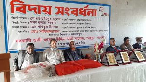 পাবনার ভাঙ্গুড়া উপজেলার সরকারি হাজী জামাল উদ্দিন ডিগ্রি কলেজের তিন গুণি শিক্ষককে বৃহস্পতিবার বিদায় সংবর্ধনা দেওয়া হয়। বিদায়ী শিক্ষকরা হলেন, ব্যবস্থাপনা বিভাগের বিভাগীয় প্রধান ও সহকারী অধ্যাপক মলয় কুমার সরকার, উদ্ভিদ বিদ্যা বিভাগের সহকারী অধ্যাপক ও বিভাগীয় প্রধান কে এম হামিদুর রহমান এবং ভুগোল ও পরিবেশ বিদ্যা বিভাগের বিভাগীয় প্রধান ও সহকারী অধ্যাপক সখিকুল ইসলাম।